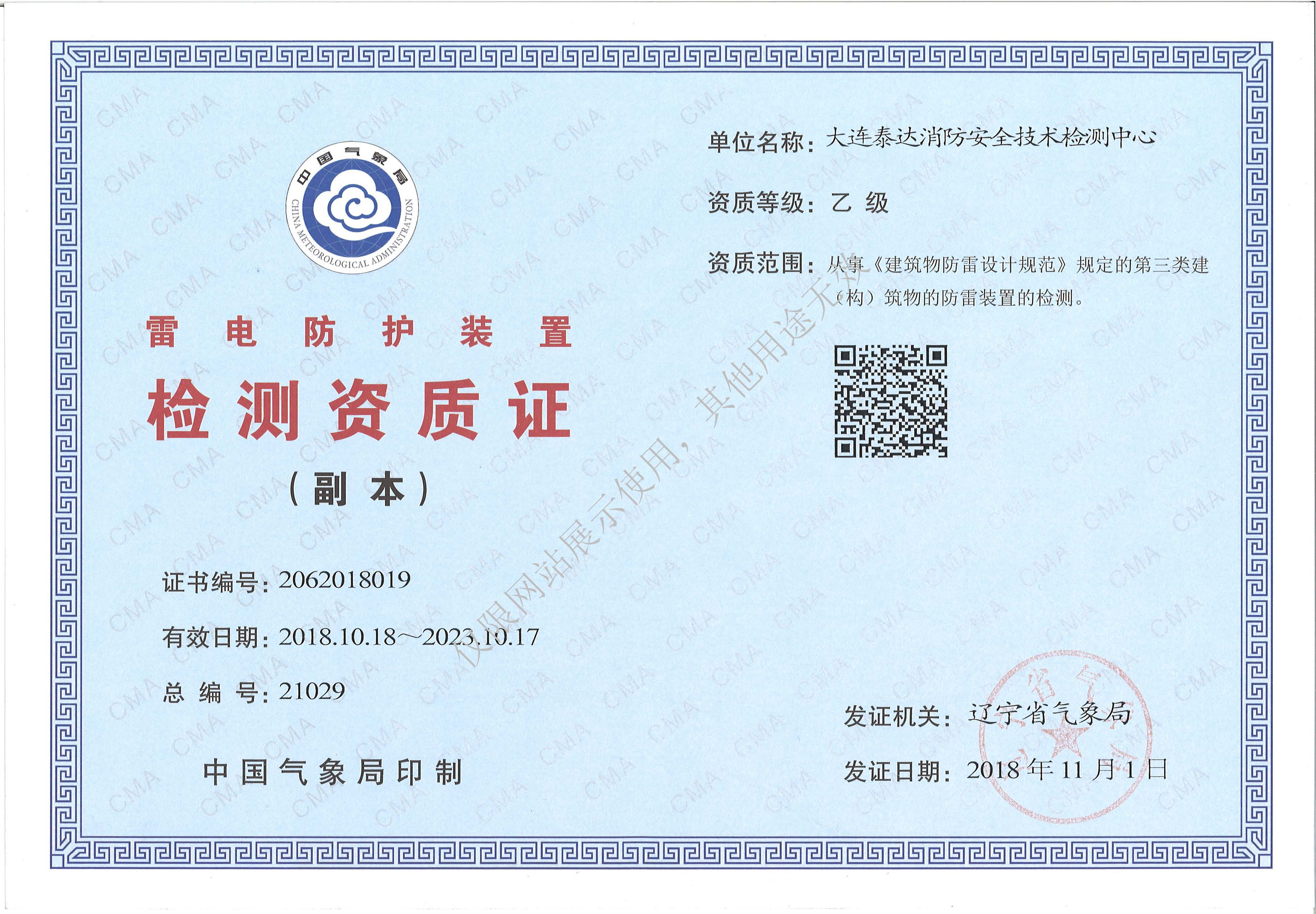 · 是經(jīng)“社會消防技術(shù)服務(wù)信息系統(tǒng)”備案并公示的消防技術(shù)服務(wù)機構(gòu),已取得中國氣象局頒發(fā)的雷電防護裝置檢測資質(zhì)證書、遼寧省質(zhì)量技術(shù)監(jiān)督局審核批準的檢驗檢測機構(gòu)資質(zhì)認定證書(CMA)及包括消防檢測、電氣檢測、雷電防護裝置檢測、防火涂層厚度檢測等在內(nèi)的200余項檢驗檢測能力,取得大連市應(yīng)急管理局頒發(fā)的安全生產(chǎn)標準化證書,獲得質(zhì)量管理體系、環(huán)境管理體系、職業(yè)健康安全管理體系認證證書,是經(jīng)備案的高新技術(shù)企業(yè),可獨立出具具有證明作用的檢測報告。